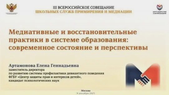 9 декабря 2025 года состоялось III Всероссийское совещание школьных служб примирения и медиации при поддержке Министерства просвещения Российской Федерации. Оператор мероприятия – федеральное государственное бюджетное учреждение «Центр защиты прав и интересов детей».