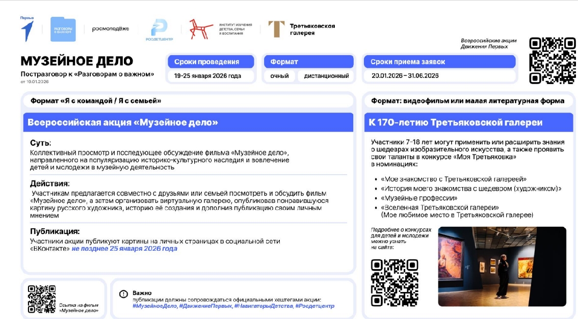 19 января в школе Калтанского СУВУ прошло внеурочное занятие «Разговоры о важном», посвящённое российским музеям — хранителям богатейшего материального и нематериального культурного наследия страны, посвященное 170-летию Третьяковской галерее.