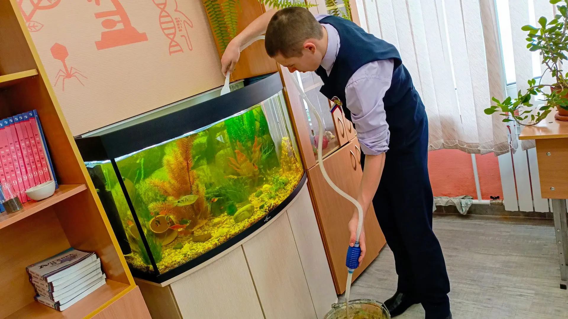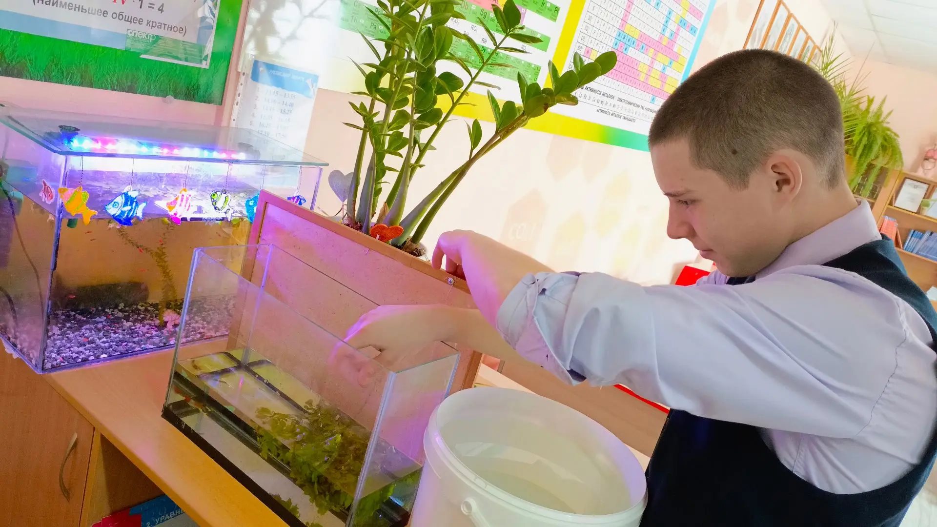 Наш главный аквариумист Тарасов Дмитрий с успехом справляется со своим поручением, которое стало для него приятным и любимым занятием в школе.