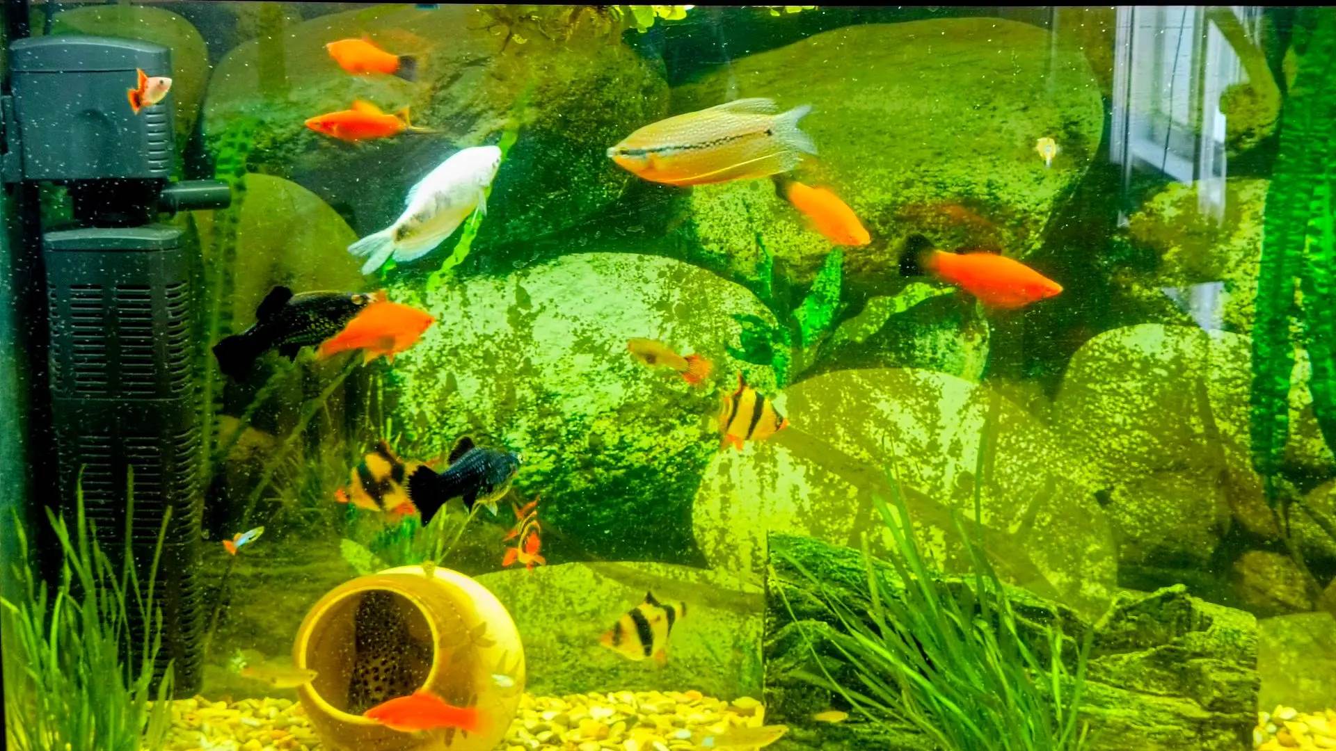 Недавно проведена большая серьезная работа: очищены стенки аквариума от налета, просифонирован грунт от остатков корма и отходов, подменена часть воды на свежую, промыты фильтры.