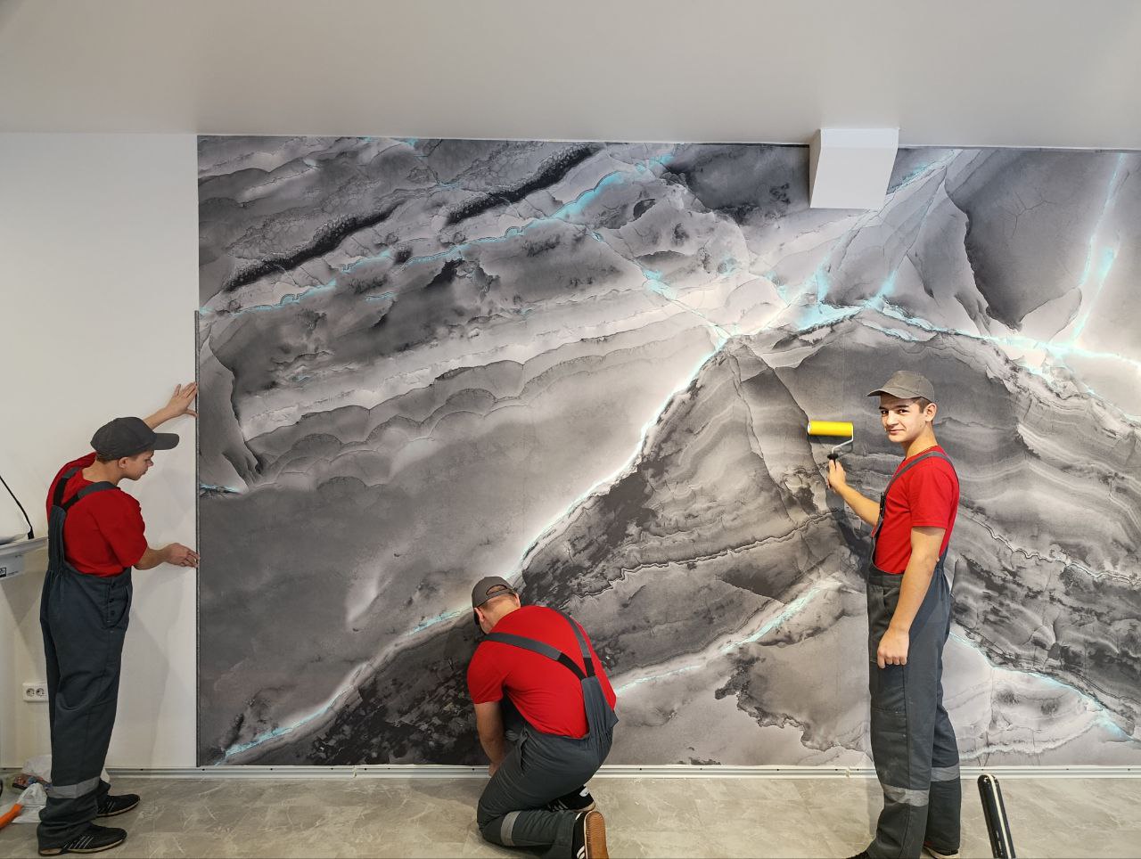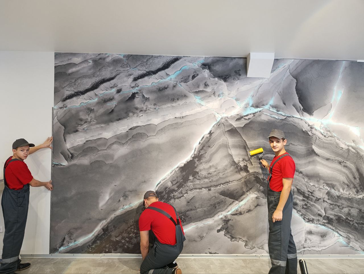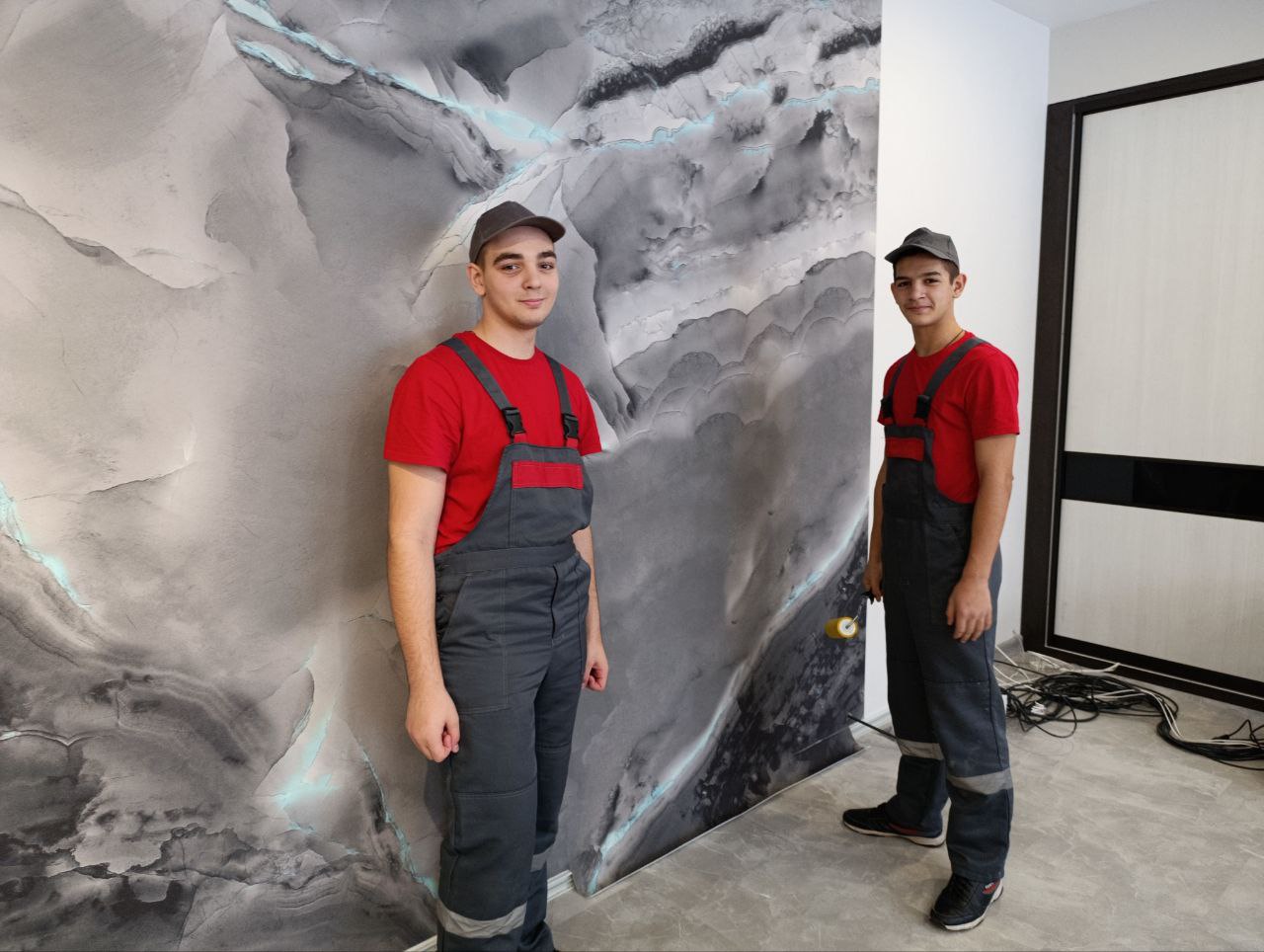 В рамках проведения ремонтных работ в методическом кабинете, наши воспитанники активно участвуют в процессе, отрабатывая практические навыки оклейки «каменных обоев».