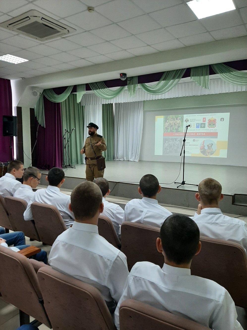 Первое было организовано в актовом зале для всех воспитанников и педагогов на историческую тему «Интерактивная выставка «Сталинград», которое проходит в рамках историко-патриотического интерактива «Сталинград».Вниманию были представлены макеты исторического оружия, снаряжение солдат и офицеров Красной Армии, копии наград периода Великой Отечественной войны.Михаил Дмитриевич рассказывал о судьбах людей, которые брали на себя ответственность за безопасность других в ходе битвы. Участникам мероприятия была предоставлена возможность поучаствовать в киновикторине, интерактивной выставке. Мальчишки не просто познакомились с видами боевого оружия времен Великой Отечественной войны, но и смогли подержать оружие в своих руках. Далее была проведена игра «Сталинградская битва: контрнаступление», где воспитанники попробовали себя в роли полководцев «Разведка пехоты», «Танкисты», «Офицер авиации». В конце мероприятия для ребят была организована фотосессия. На протяжение всего мероприятия поддерживалась теплая атмосфера, встреча подарила море позитива. Педагоги и воспитанники получили огромный заряд энергии и хорошее настроение.