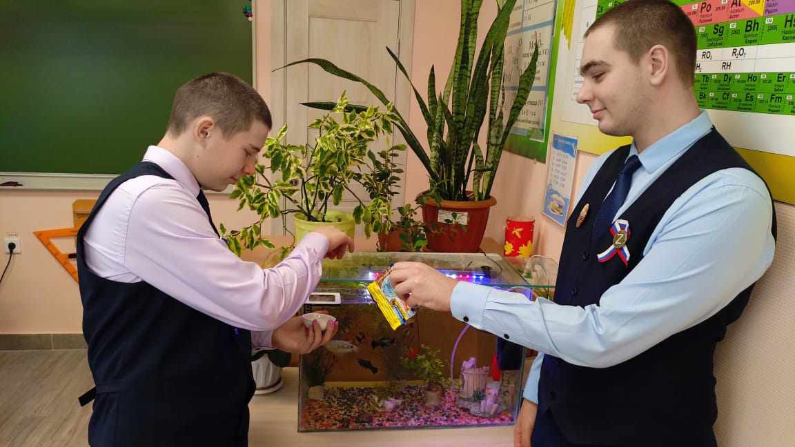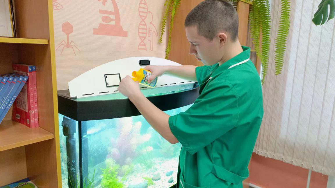 Главный аквариумист – Тарасов Дмитрий. Он тщательно следит за чистотой воды, регулярно меняет её часть и очищает стёкла от налёта. Когда рождаются мальки, Дмитрий отсаживает их в отдельный аквариум-малёчник; разводит рачков-артемий для кормления мальков и трепетно ухаживает за ними. После выпуска Дима и дома решил продолжить заниматься аквариумистикой и поступить учиться на ветеринара.