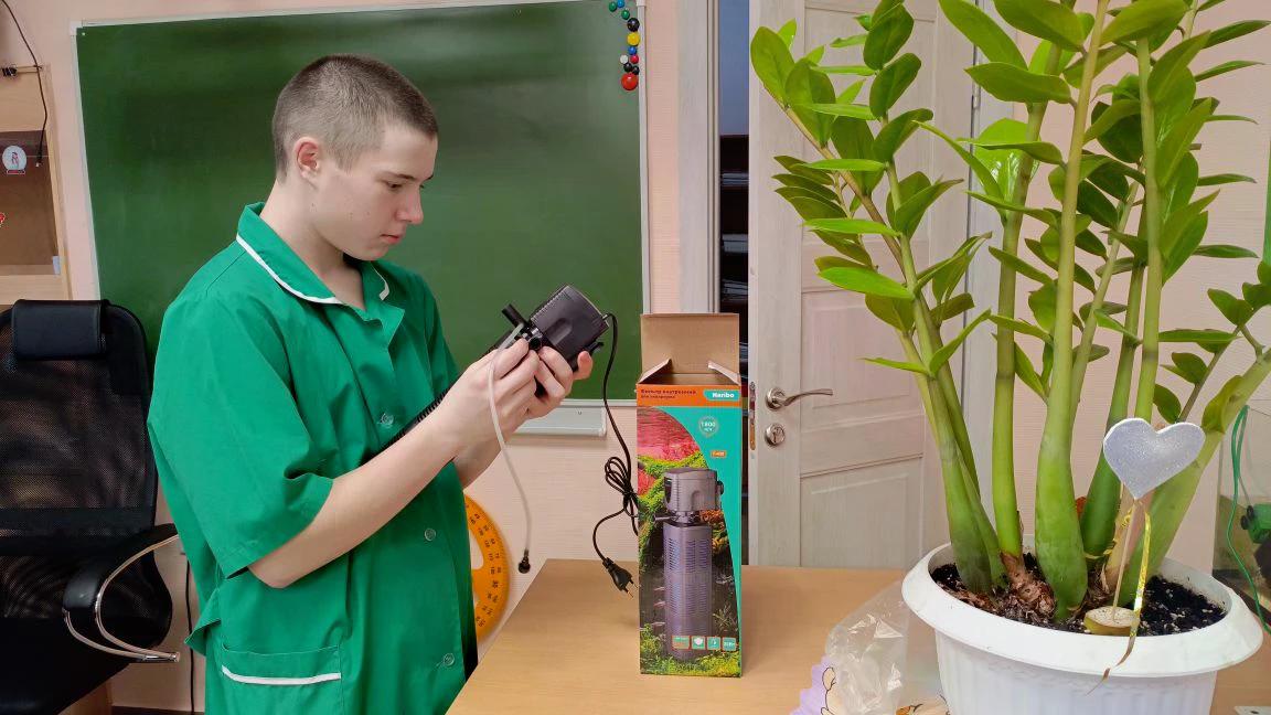 В школе Калтанского СУВУ есть особенное место, где каждый может прикоснуться к миру природы — это живой уголок. Особое внимание здесь уделяется аквариуму, за которым с любовью ухаживают Тарасов Дмитрий и Гребенников Никита, а другие воспитанники с удовольствием им помогают.