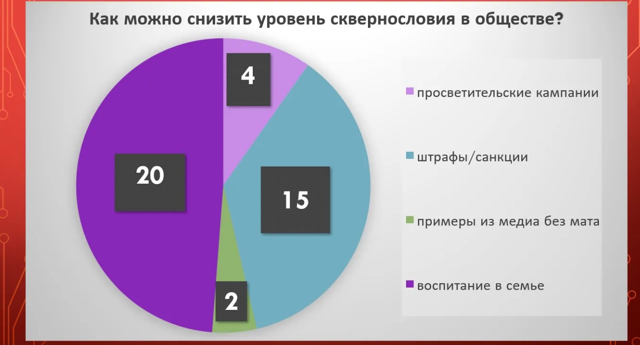 В ходе мероприятия воспитанники познакомились с историей возникновения мата на Руси, какое влияние на здоровье человека оказывает бранная речь. Были разобраны ситуации, с точки зрения психологии, почему человек употребляет в своей речи нецензурную лексику. Пришли к выводу, что многие люди не умеют владеть своими эмоциями, не могут подобрать правильные слова в момент агрессии, низкий словарный запас не позволяет выразить недовольство литературными словами (хотя бытует мнение, что бранными словами пользуются, отнюдь не безграмотные люди с низким словарным запасом, а, наоборот, те, кто владеет филигранно русским языком), а срываются на сквернословие, но и, конечно, нельзя не брать во внимание и окружение подростков, которое, зачастую, разговаривает только, используя экспрессивные слова и выражения. Многие считают мат хорошим средством эмоциональной разрядки, оказывающим помощь в снятии стресса.