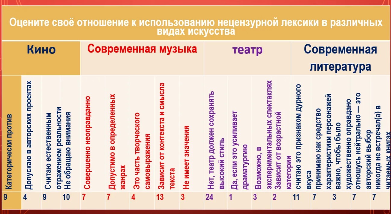 В течение недели воспитанники готовились к мероприятию: рисовали слоганы-призывы, учили стихи, штудировали сценарий, примеряли на себя роли ученых, юристов, историков, литературоведов и филологов, отвечали на вопросы анкеты «Сквернословие в современной речи». Анкета была разбита на блоки, в которых были острые и актуальные вопросы, относящиеся к употреблению ненормативной лексики в повседневной жизни, в литературе и искусстве, театральных постановках, кино, какое влияние оказывает употребление нецензурных выражений на сознание, на взаимоотношения между людьми и др. Анкета подразумевала анонимность, что и привело к откровенным ответам на вопросы, что отметили сами воспитанники.