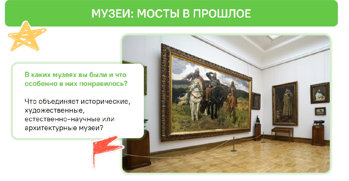 Особое внимание было уделено Третьяковской галерее, как одному из самых значимых музеев страны. Учащиеся узнали об истории её создания, основателе Павле Михайловиче Третьякове, его вкладе в развитие русского искусства. Были рассмотрены ключевые произведения галереи, такие как «Явление Христа народу» Александра Иванова, «Утро стрелецкой казни» Василия Сурикова, «Алёнушка» Виктора Васнецова. Обсуждались сюжеты картин, их символика, а также биографии художников.