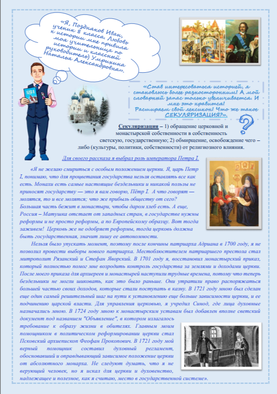 Я, Поздняков Иван, из города Калтана, учащийся 8 класса Калтанского СУВУ. Участвую в конкурсе «История России моими глазами». Инициатором моего участия в конкурсе стала учитель истории Наталья Александровна. Благодаря ее предложению, я получил возможность по – новому взглянуть на ключевые события XVIII века и попробовать себя в роли исследователя. Для участия в конкурсе я выбрал исторический термин «секуляризация» XVIII века и подготовил рассказ в формате станицы – презентации об историческом термине под руководством Умрихиной Натальи Александровны.