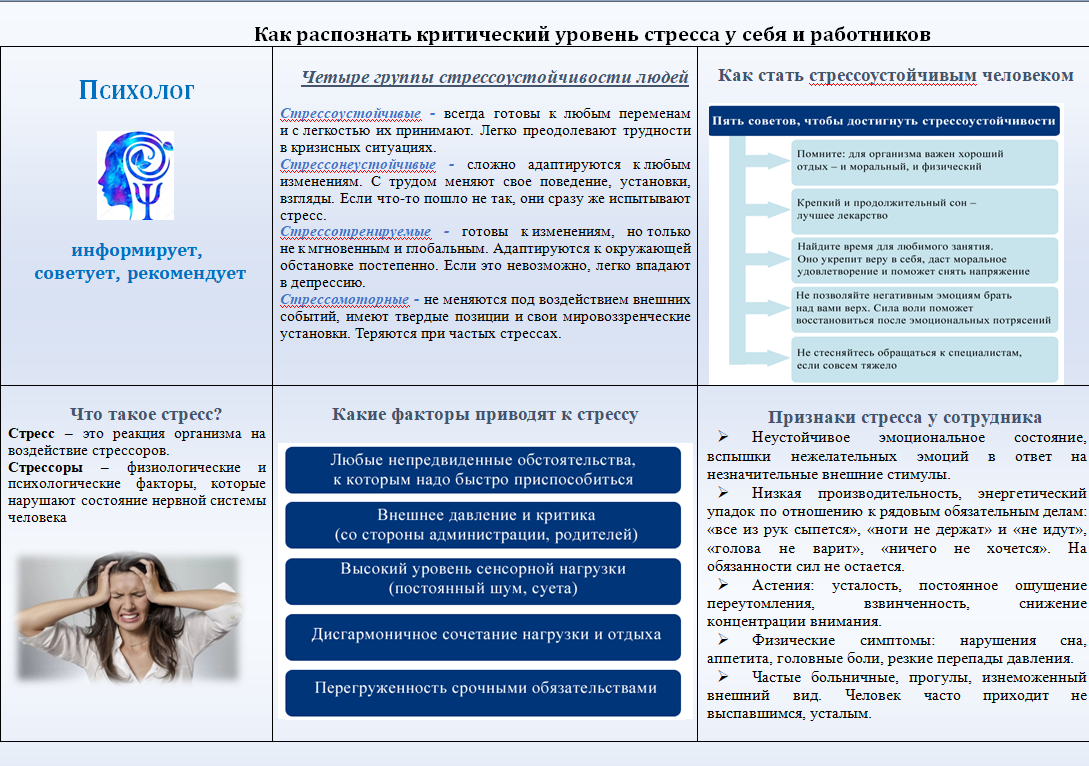 Предлагаем вашему вниманию памятку «Как распознать критический уровень стресса у себя и работников». В памятке отражены ключевые признаки, которые помогут определить стрессовые состояния. Это физические симптомы, эмоциональные проявления, когнитивные нарушения и изменение поведения.