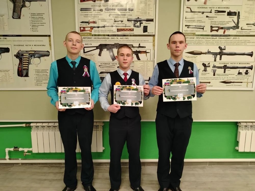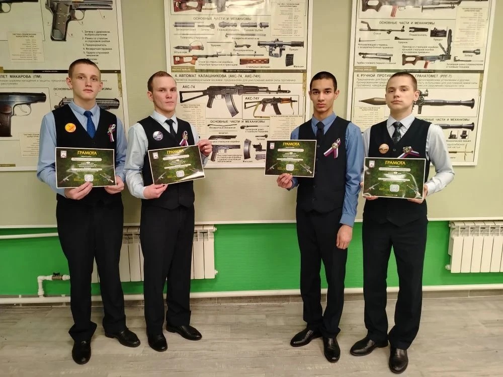 Сегодня грамотами были награждены участники конкурса «Разборка-сборка автомата АК-74», и мы рады сообщить, что в этом захватывающем соревновании 1 место занял Прытков Матвей, 2 место – Молодых Михаил, 3 место разделили Федоритенко Данил и Павленко Иван.