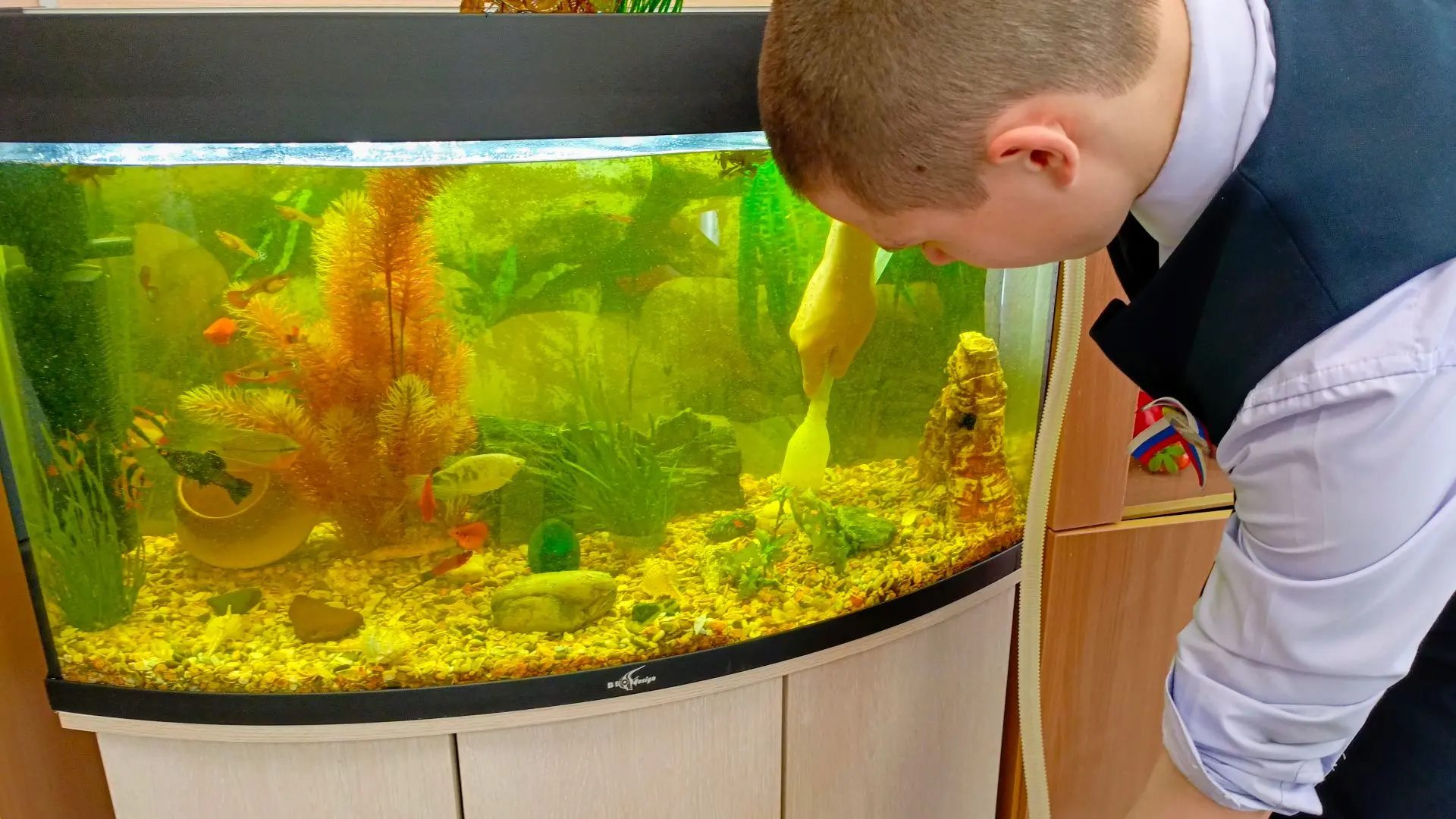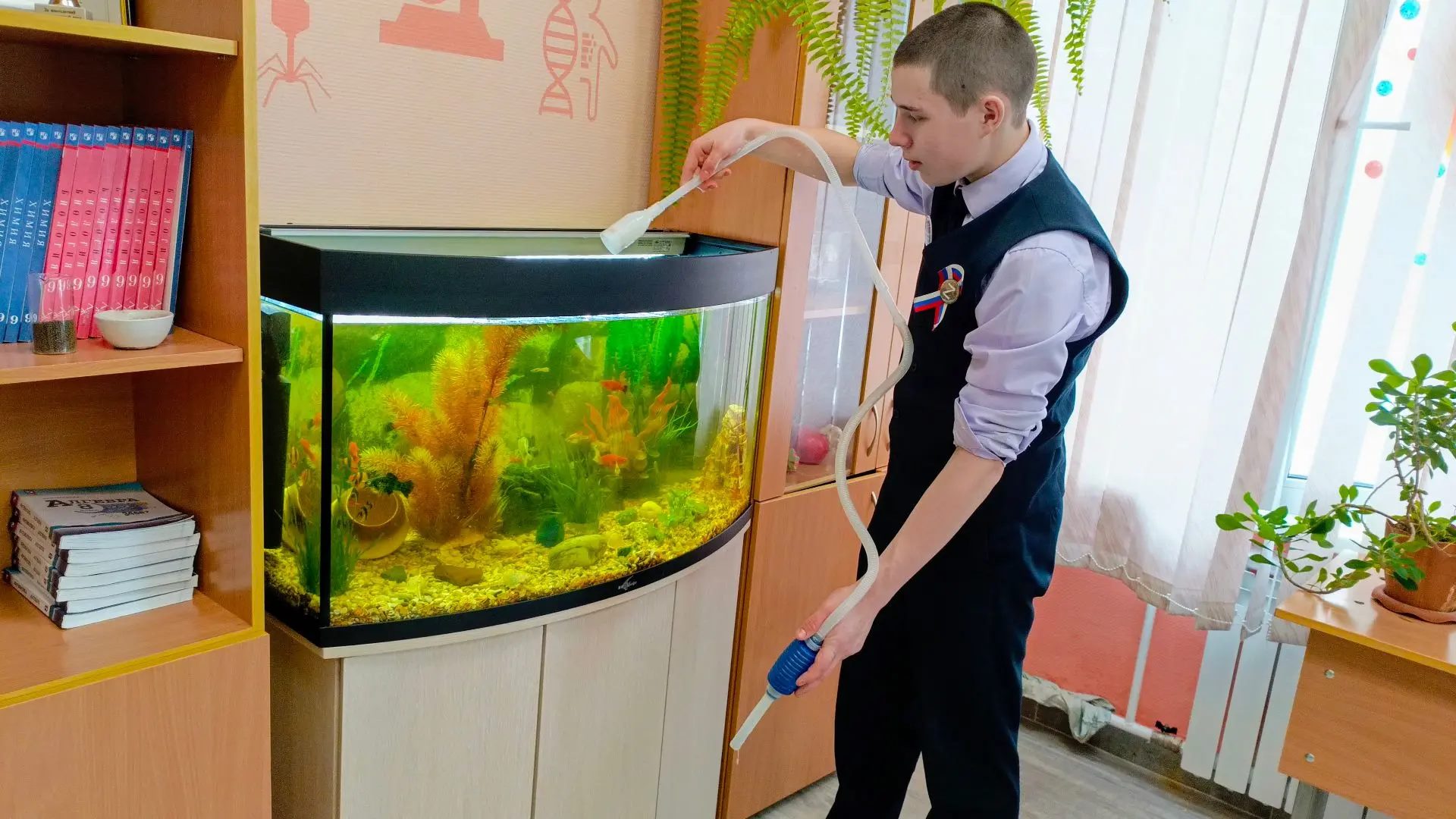 Наш главный аквариумист Тарасов Дмитрий с успехом справляется со своим поручением, которое стало для него приятным и любимым занятием в школе.