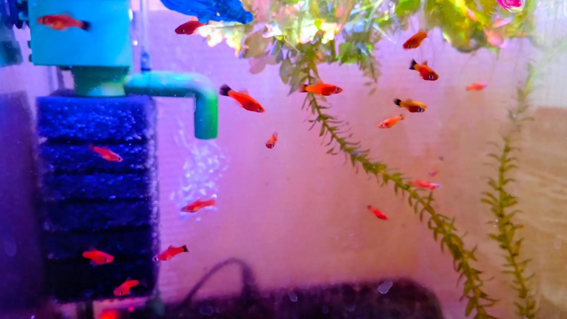 Быстро подрастает молодь рыбок меченосцев, мальки хорошо набирают вес, употребляя живой корм, который выращивает Дмитрий. Скоро наступит время переселения мальков в общий аквариум.