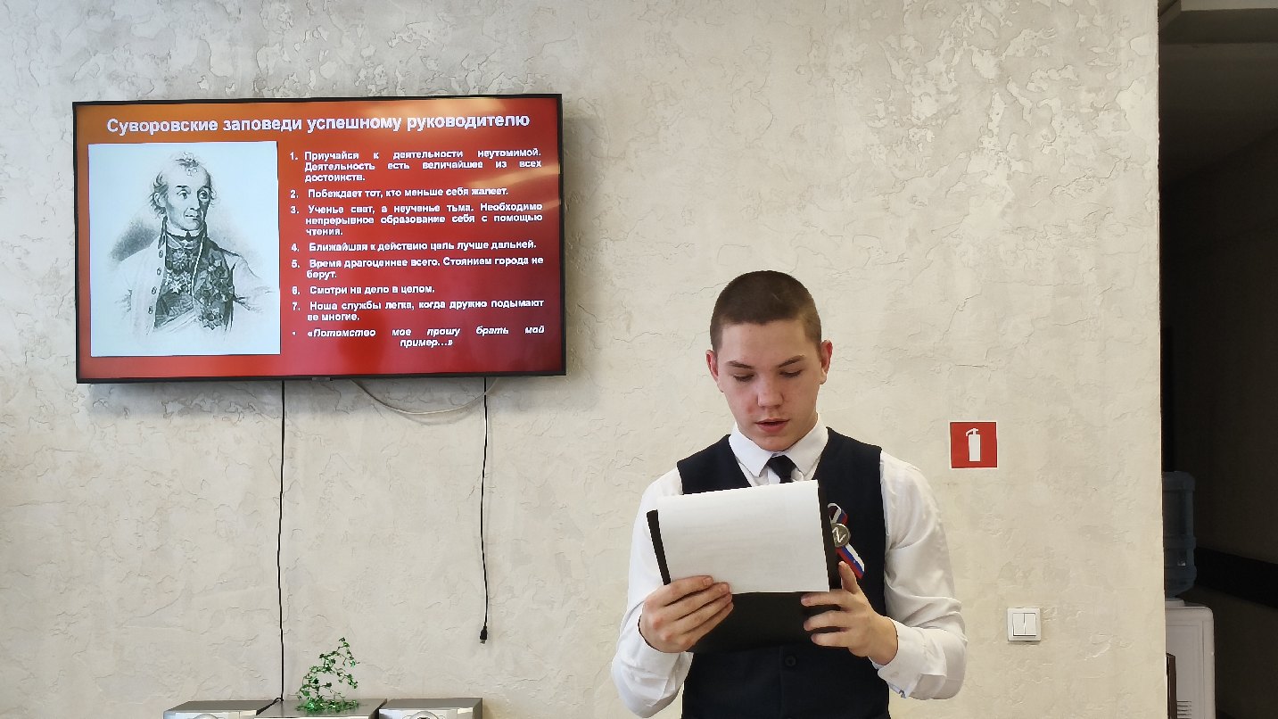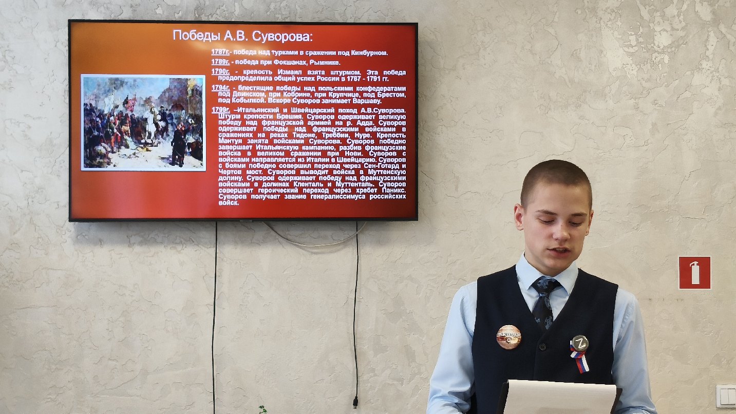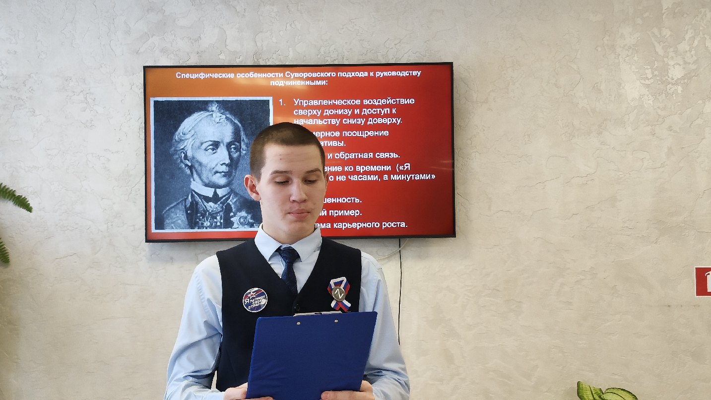 Подростки в ходе мероприятия познакомились с биографией великого русского полководца, который из 99 битв не проиграл ни одной. Ребята отметили такие качества А.В. Суворова, как честность, справедливость, какой вклад внес Суворов в совершенствование военной науки. А.В. Суворов оставил после себя военно-историческое наследие, которое отразилось в книгах «Полковое учреждение» и «Наука побеждать». У главнокомандующего была своя выработанная управленческая система, в которую вписывались «три воинских искусства» по Суворову: глазомер, быстрота и натиск. Ребята познакомились с качествами полководца, которые вызывали любовь и уважение подчиненных: простота в обращении, признании заслуг подчиненных, честность.