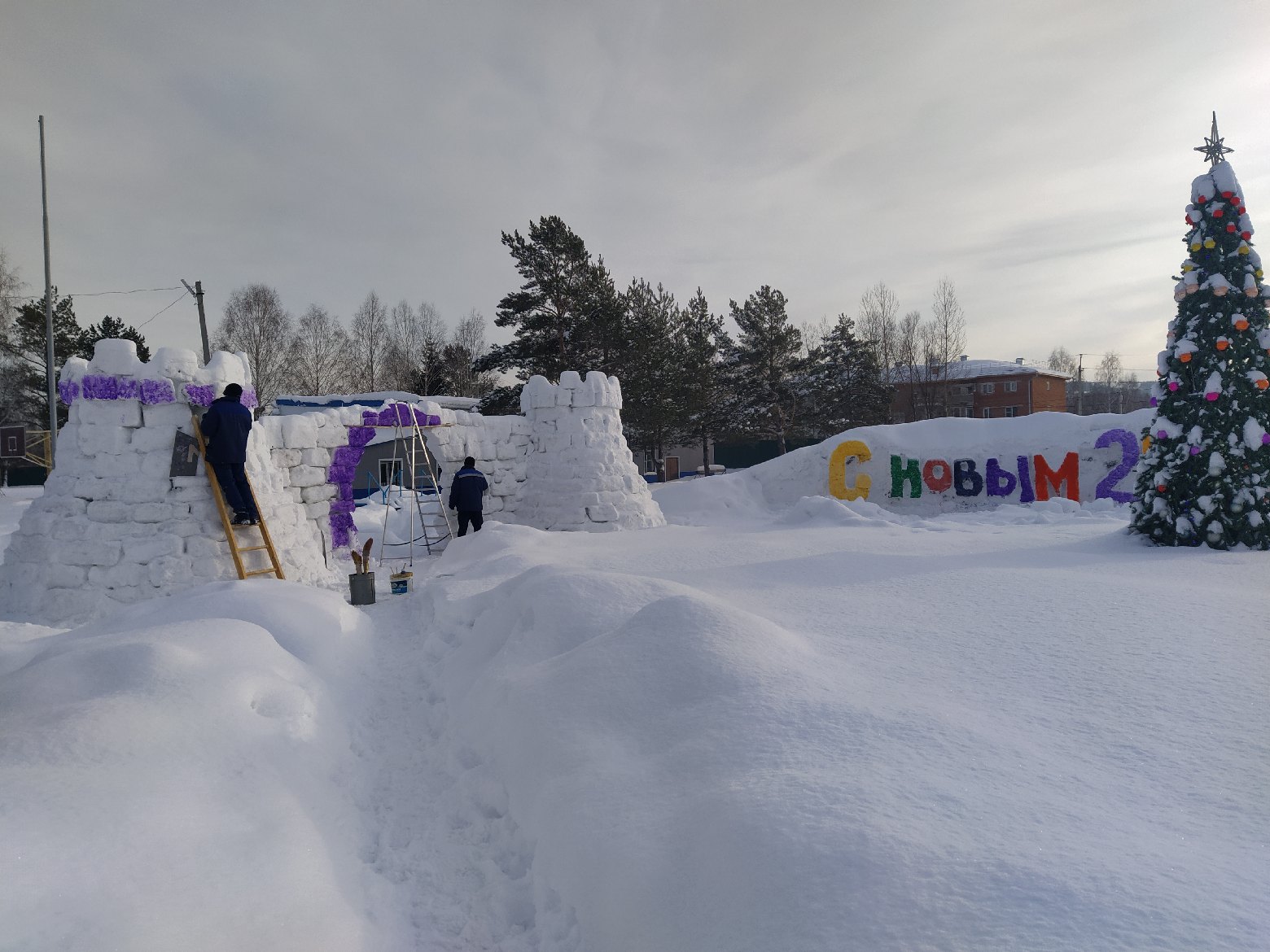 За несколько дней рядом с нарядной елкой вырос снежный городок. Ребятам удалось подарить и воспитанникам, и сотрудникам отличное праздничное настроение!