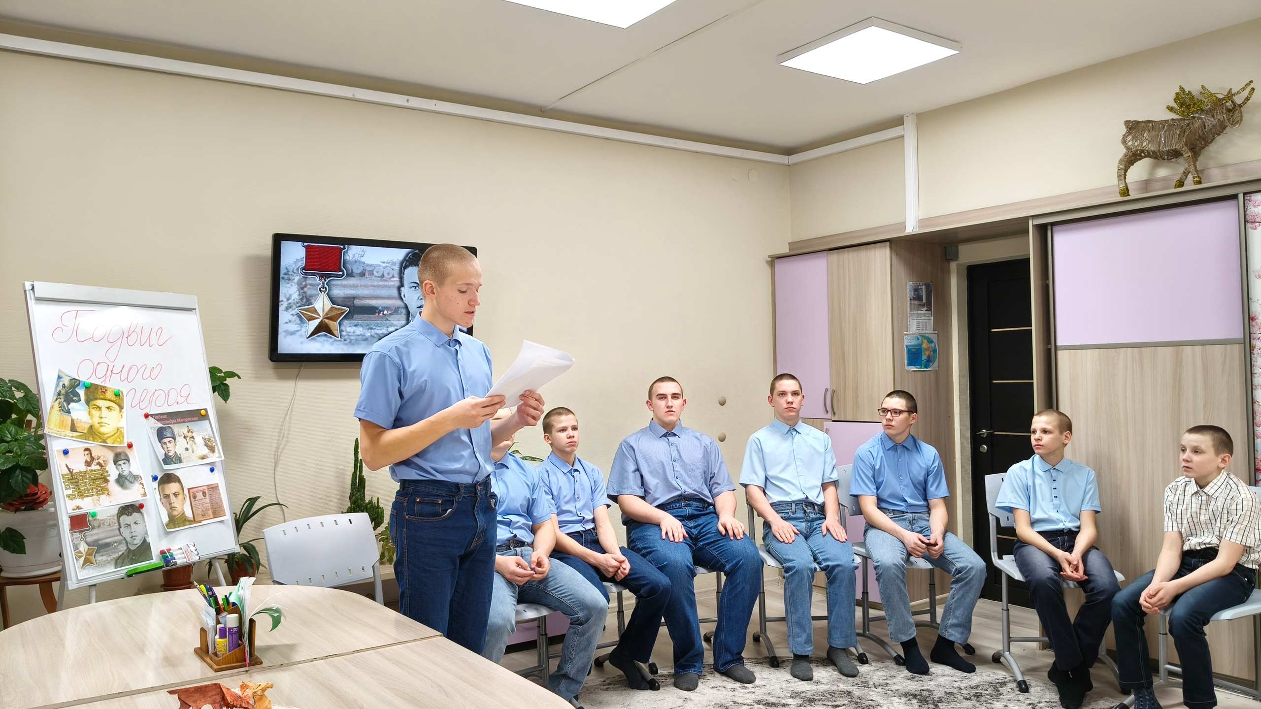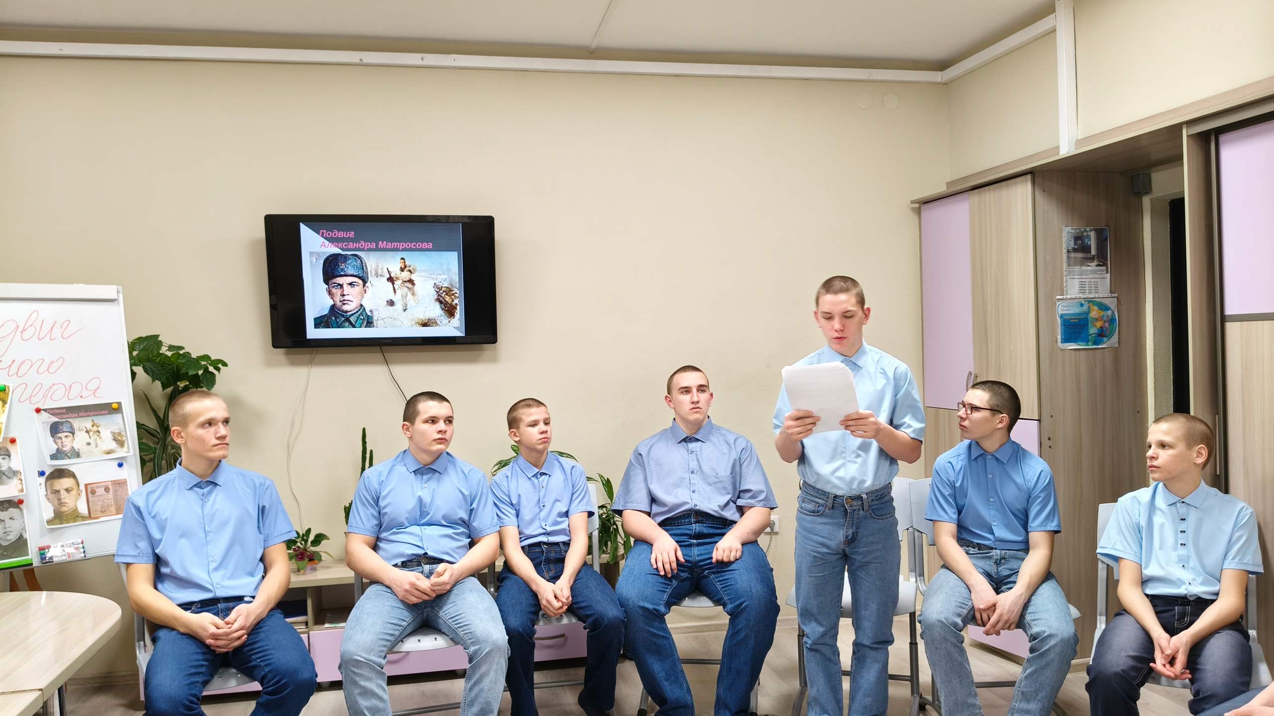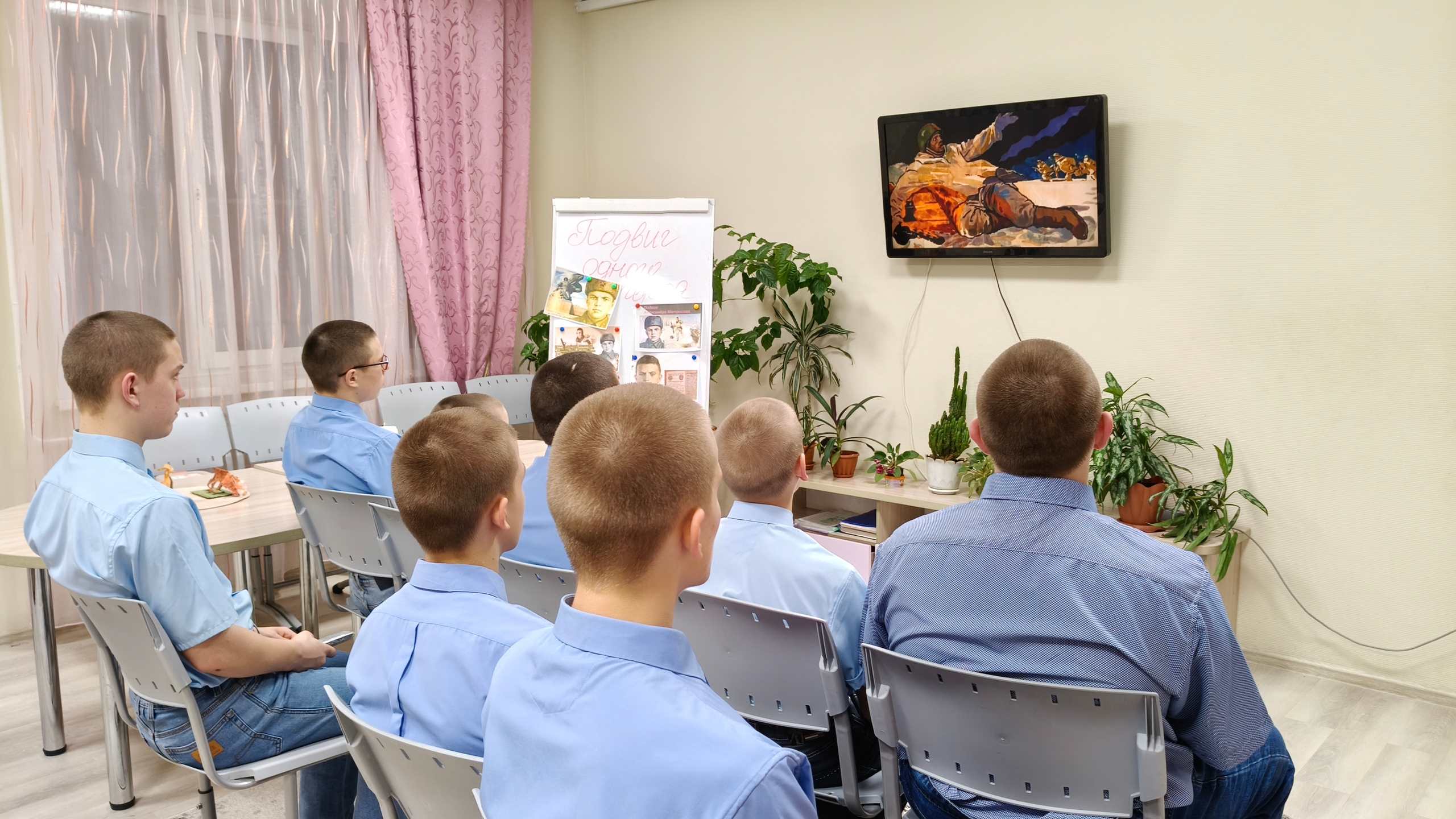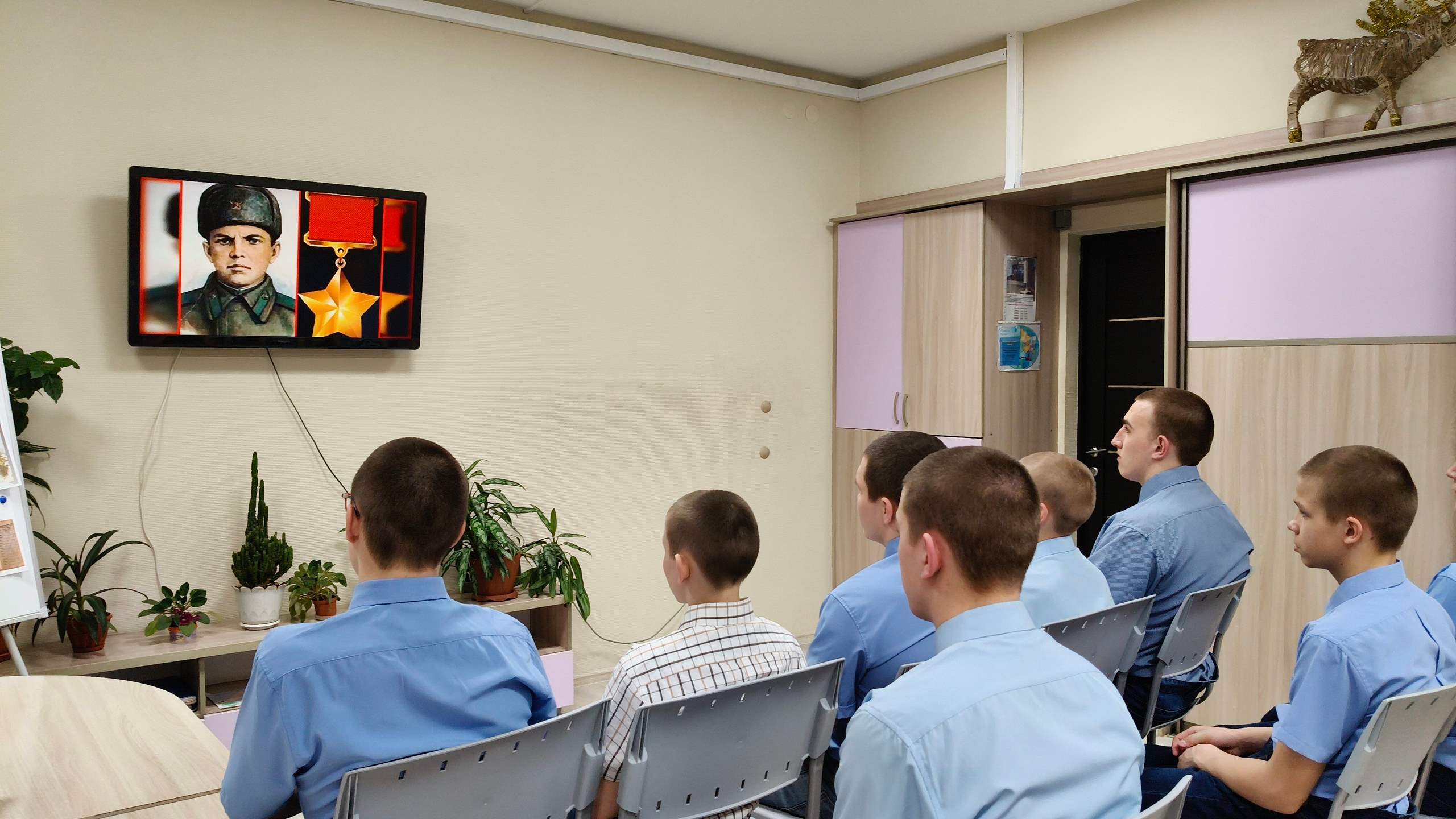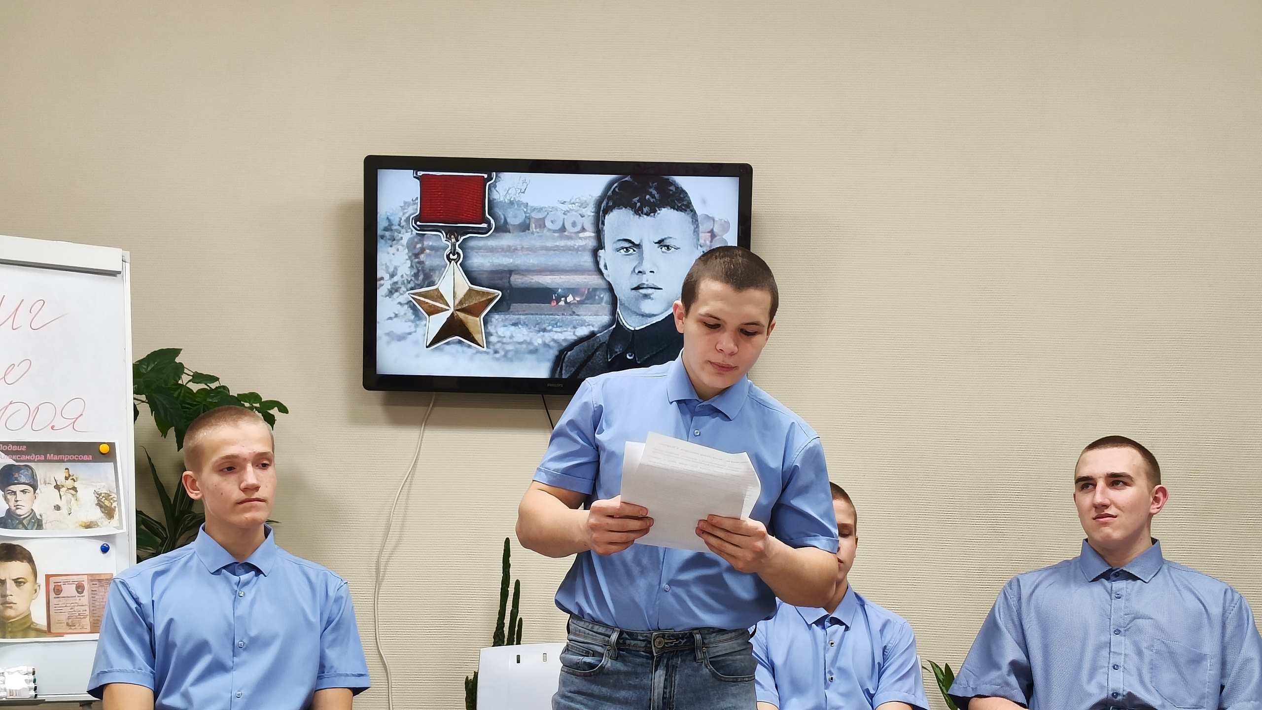 Воспитанники посмотрели тематический видеоролик о подвиге 19-летнего простого парня, который 27 февраля 1943 года близ деревни Чернушки Псковской области ради спасения боевых товарищей закрыл грудью амбразуру вражеского дзота, обеспечив атаку родного взвода ценой своей жизни.